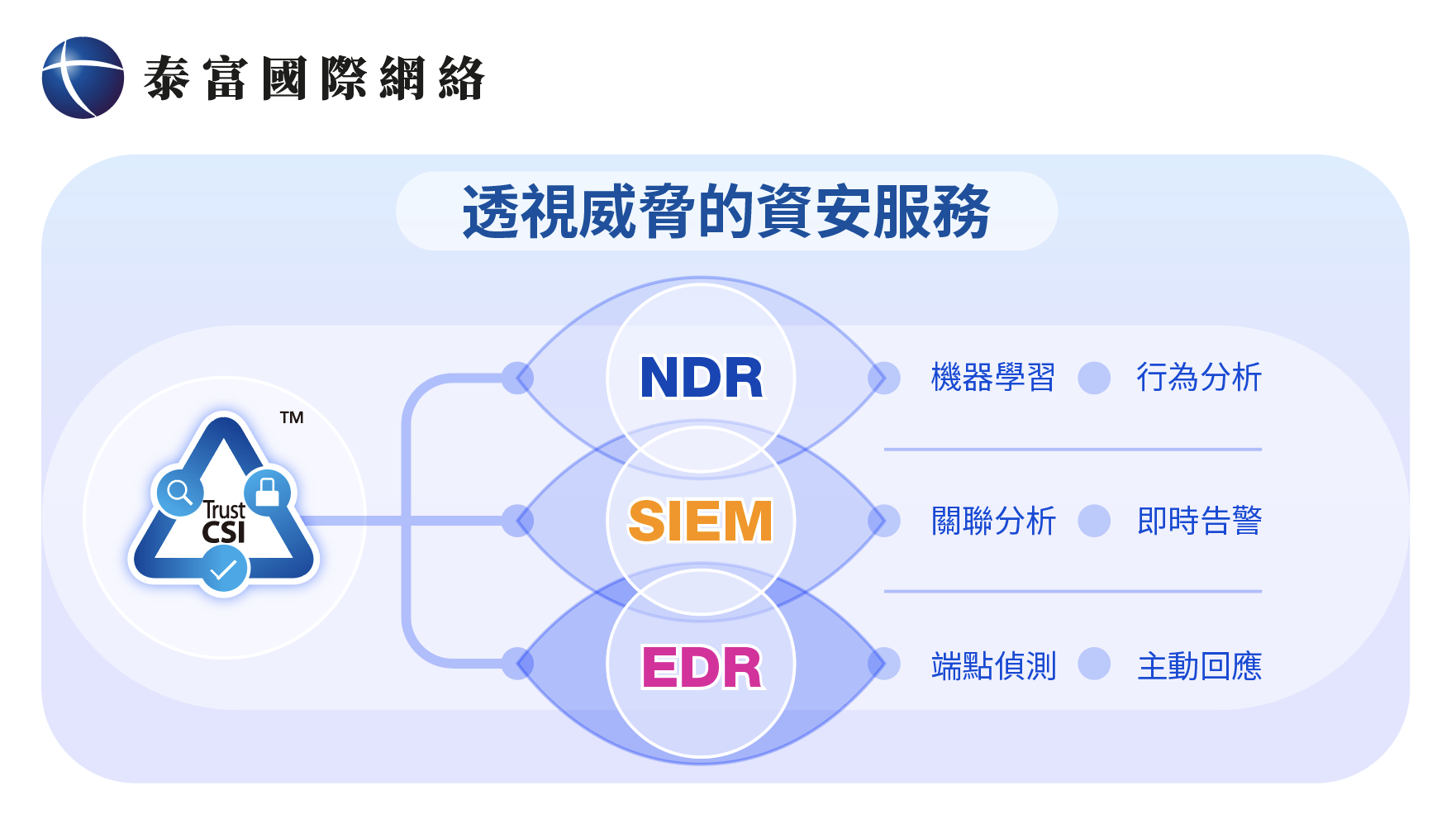 TrustCSITM資訊安全管理服務,結合機器學習打造具備主動偵測、阻斷威脅、關聯分析的智慧資安聯防,整合EDR端點偵測與回應、NDR網路行為分析、先進雙核心的SIEM安全資訊及事件管理平台與SOC資安維運中心,有效透視端點層、應用層與網路層資安威脅。其中全天候營運的SOC服務,擁有多項ISO與國際資安認證的專業人才,結合雙核心SIEM平台廣泛威脅情資,智慧分析關聯數據,有效識別各類未知新興威脅,透過技術、人才、流程三大專業核心,為企業奠定進階威脅的防護基礎。